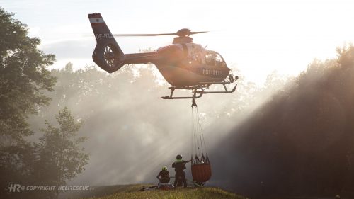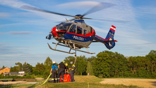 In Trautmannsdorf an der Leitha war ein Holzstoß in Brand geraten und hatte bereits auf die angrenzenden Bäume übergegriffen. Um eine weitere Ausbreitung des Feuers zu verhindern wurden rund 20 Punktabwürfe durch den Hubschrauber des BM.I getätigt.