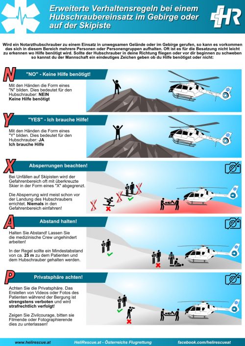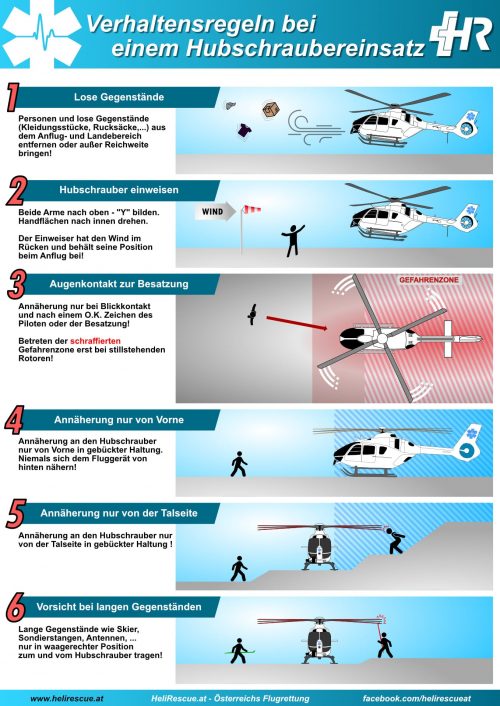 Hier findet Ihr die Verhaltensregeln und die erweiterten Verhaltensregeln bei Hubschraubereinsätzen. Die von uns erstellte Version kann kostenlos heruntergeladen, gedruckt und veröffentlicht werden. Diese stehen in den Sprachen Deutsch und Englisch zur Verfügung. Ziel dieser zwei Seiten ist es, Rettungseinsätze sicherer zu machen indem die breite Bevölkerung mehr Information über das Verhalten erhält.